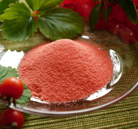 採用草莓果汁粉為原料,經特殊的乾燥與造粒技術製成。保有自然濃厚的水果香氣,顆粒均勻細緻,流動性良好,外觀呈粉紅色,可以迅速溶解於冷水或冰水之中。適用於即溶幼兒食品、即溶保健食品、即溶調味奶粉、即溶穀物食品、即溶果凍粉、餅乾夾心餡、休閒食品、膨發食品及乾脆麵等。